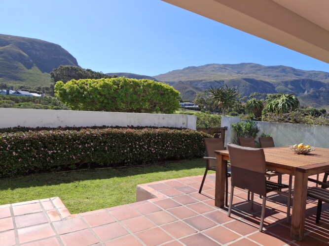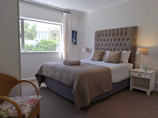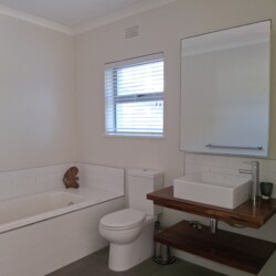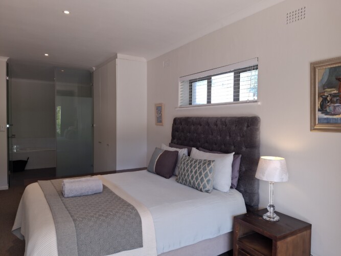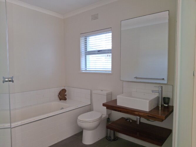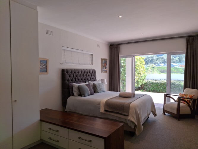 - Bedroom 1 (downstairs): Queen bed, en suite bathroom with bath only. Opens up onto downstairs patio with lovely views of Hermanus mountains