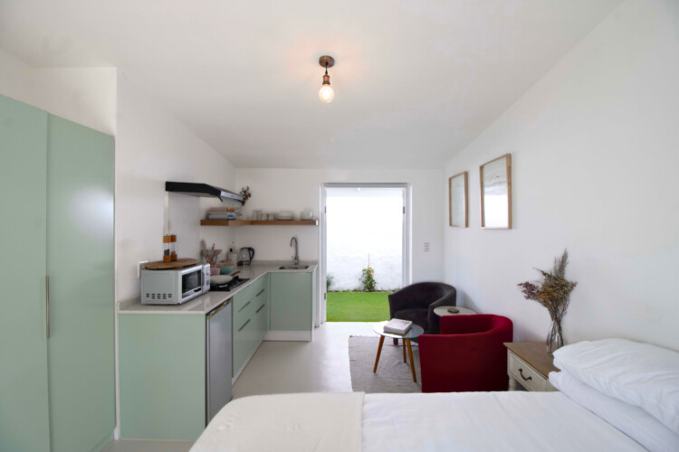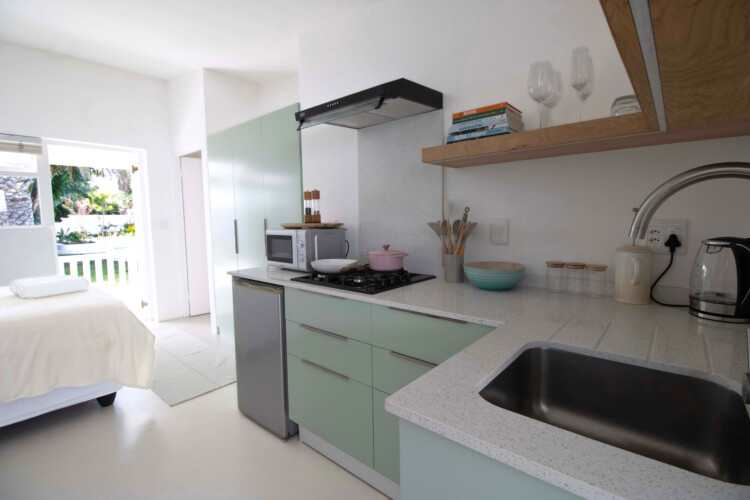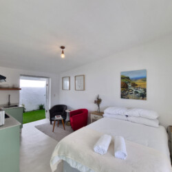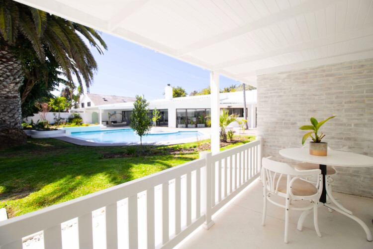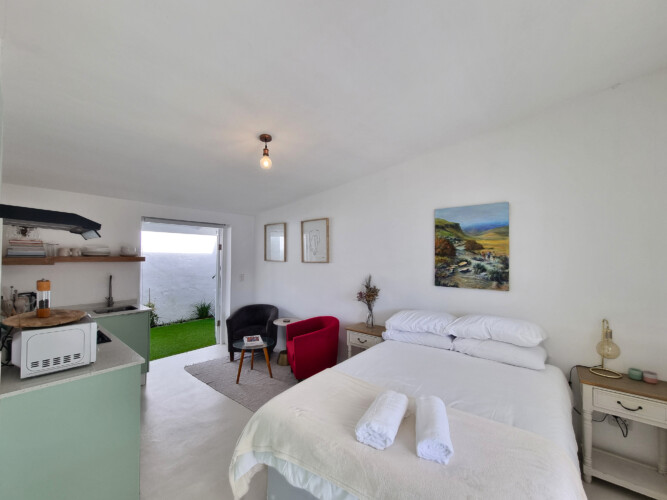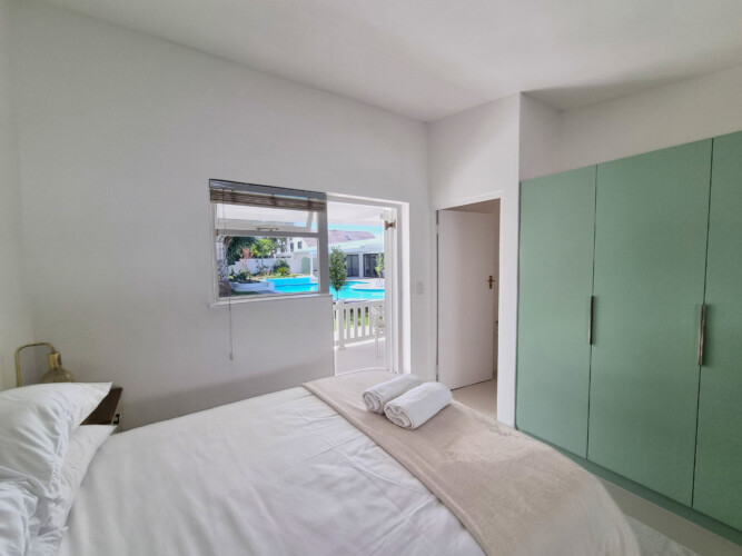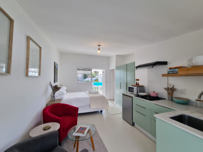 Discover a stylish bachelor holiday apartment perfectly situated on the main road of Hermanus. One of just six exclusive units, each apartment overlooks a serene communal pool that feels like your own private oasis, surrounded by lush greenery and offering breathtaking mountain views from the poolside.