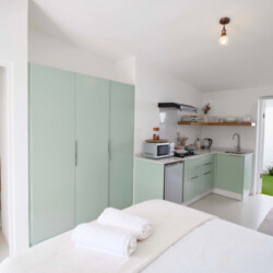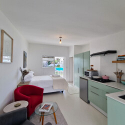 These modern apartments feature private bathrooms and well-equipped kitchenettes, ensuring both comfort and convenience for your stay. Whether you’re relaxing by the pool or enjoying the contemporary interiors, you’ll appreciate the thoughtful design and amenities throughout.