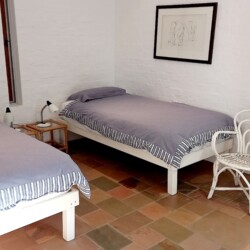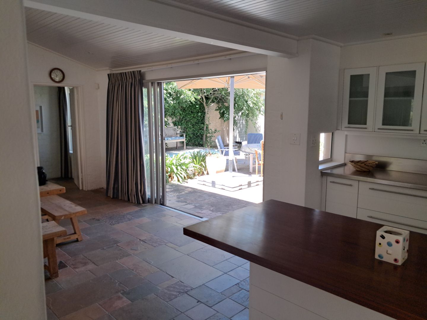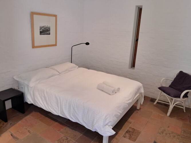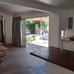 The cottage offers a spacious open plan lounge and dining area as well as a well equipped kitchen. There is a main bedroom and an en suite bathroom, 2 bedrooms and a bathroom The living area is airy and bright with sliding doors on two sides: One side opens to the splash pool in the protected court yard and the other onto a large wooden deck that looks out over the mountains.